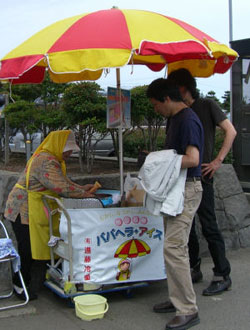 能代についてバイパスを降りると程なく道ばたにカラフルなパラソルが。そう、秋田名物ババヘラです。アイスと言ってもあっさりしたジェラートのような味です。ステンレスの保冷缶に入ったアイスを金属のヘラで上手にすくって盛り付けてくれます。