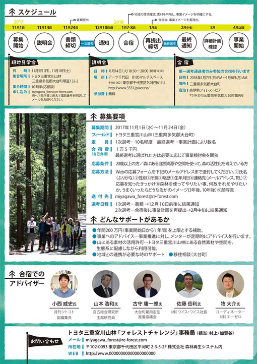 自然豊かな宮川山林の森で、新たな事業を起こしてみませんか?森を活用し、森と関わり生きて行く。本事業は、そんなチャレンジャーを応援します!