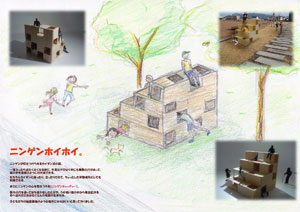 | ニンゲンが引きつけられる階段式の箱。外側にも内側にも無数の穴があって、迷路のよう。 穴を通って鉢合わせした時や、薄暗い箱の中から青空へ抜けられた時に笑顔が生まれる、子供の秘密基地のような場所を提案。 |