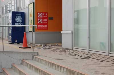 | 古川駅周辺では、このような歩道の地盤沈下がみられ、建物との段差が多く発生していた。液状化ではないが、このような歩道の地盤は地震で揺られるとずれたり流れたりしてこのような沈下現象が見られるので、本来ならばこういった部分においても設計や工事において注意をすべきであると思われる。 | ||||||||||||||||