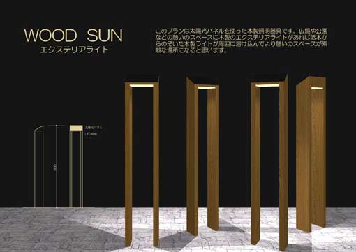 どうしても、作りたい作品だ。現実的だし、かつ、今の話題性(LED・太陽光発電等)も入っている。高さも足元を照らす程度だ。開発には、LEDやソーラーパネルのメーカーとタイアップしなければならない。弥良来杉なので耐久性はあるが、木部を壊されたりするのではと言う心配もある。公共的なところを作者はイメージしているようだが、レストランなど夜営業をするロケーションにどうだろう。