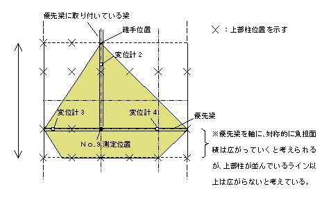 ここでは上部柱の位置と、No.9(変位計1)を取り付けた柱に取り付いている梁の継手位置などを考慮して、負担面積を算定した。