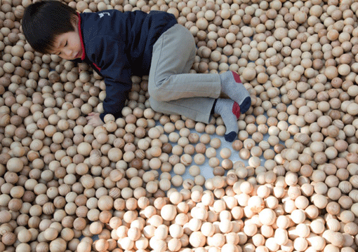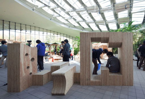 | スギダラ天草支部支部長 森信行さんによる木の遊具コーナーは子供たちに大人気。毎日、学校帰りに遊びに来る子供たちもいた。子供が遊びまわっている建築展という風情も面白い。 | ||||||||||||||||