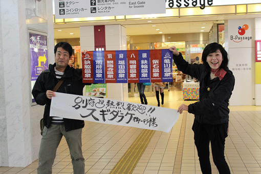 | 別府駅で熱烈歓迎。別府市職員のアベリアさん(右)とJR九州の中村さん。 | |||||||||||||
